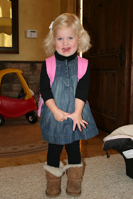 In her pink Princess backpack, Sammy has packed a Dora cup, plate, bowl, two books, and 2 combs. Please do not notice that her shoes are on the wrong feet.